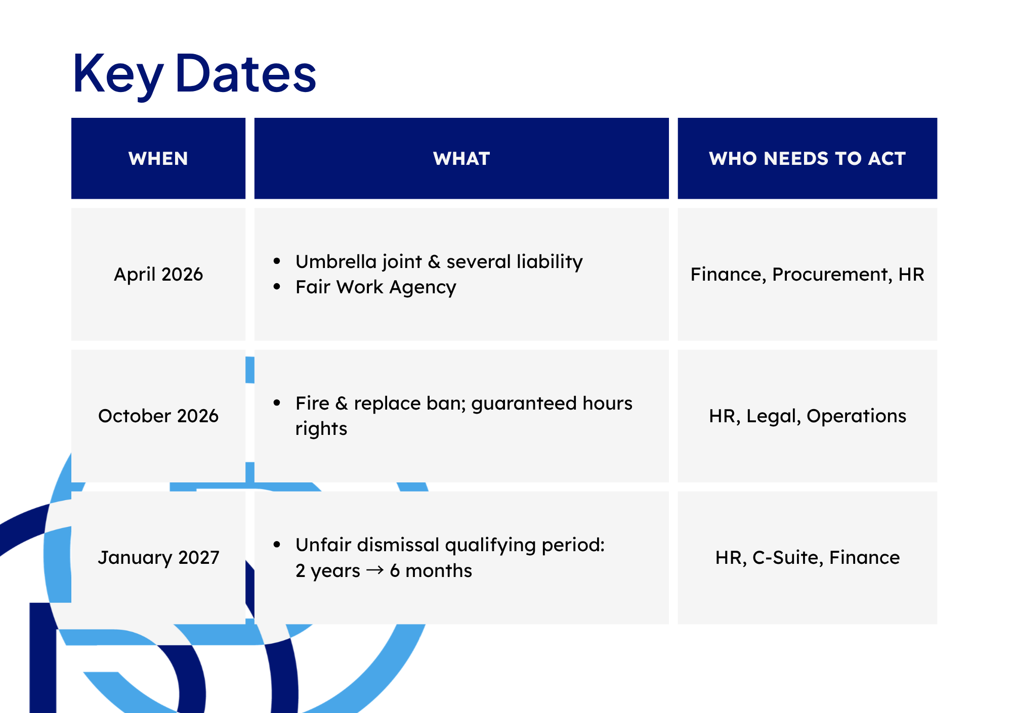 - Ensure HR, finance, procurement and hiring managers all understand the new liability regime.